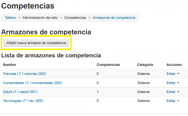 - Vaya a Administración del sitio > Competencias > Estructuras de competencia para crear competencias en el sistema, o acceda al mismo enlace desde un bloque de administración de categoría para añadirla desde una categoría
