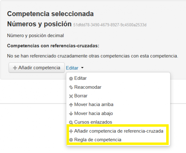 - Al hacer click en 'Editar' junto de una competencia una vez que haya sido creada y seleccionada, se mostrarán otras opciones, por ejemplo, al marcarla como "relacionada" con otras competencias o al crear una regla de finalización automática. Una regla de finalización automática le permite a una competencia el que sea completada automáticamente cuando todas las sub-competencias sean completadas.