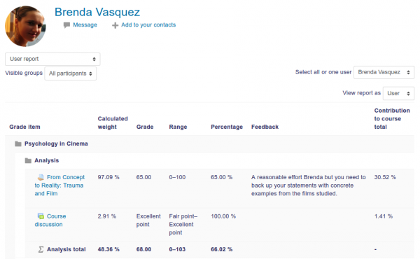 - Contribución al total del curso - una nueva columna que, si se habilita en las configuraciones de la calificación del curso, mostrará una columna de porcentajes, que indican cuanto contribuye cada ítem de calificación al total del curso del usuario (después de aplicarse la ponderación).