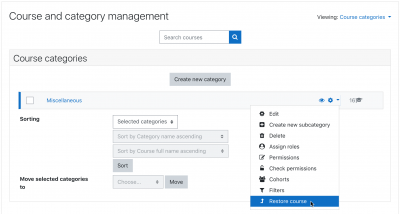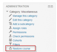 Los usuarios con permisos para acceder a Administración del sitio > Cursos > Gestionar cursos y categorías o Administración del sitio > Cursos > Gestionar cursos y categorías > (Nombre de categoría) pueden restaurar cursos desde allí:
