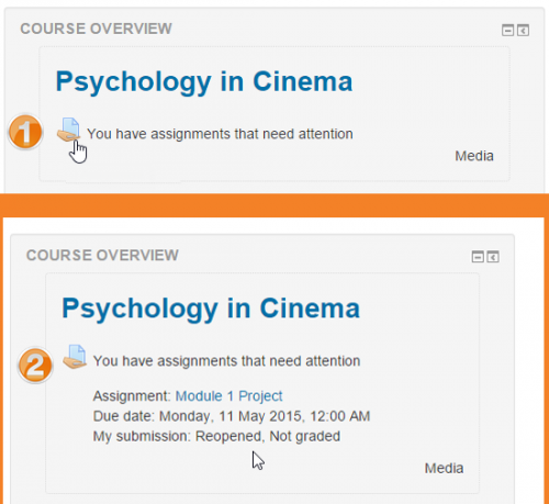 Activities with due dates and unread forum posts are displayed for each of the courses in the block. Clicking on an icon (1 in screenshot below) will expand the setting to give more information and direct the user to the relevant activity (2 in screenshot below): In the case of assignments, they will only display when the student needs to submit - or resubmit - and for teachers, when they have assignments which need grading.
