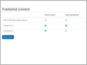- Select from a list of activities and courses to which you have access (optionally adding line items to the platform gradebook, where applicable - see note below), clicking "Add content" when done