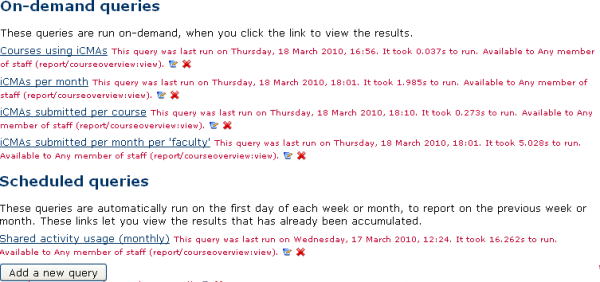 Este plugin de reporte administrativo les permite a los Administradores configurar consultas arbitrarias a la BasedeDatos para que funcionen como reportes ad-hoc. Los reportes pueden ser de dos tipos: ya sea que corran bajo-demanda, o agendados para que corran automáticamente. Otros usuarios con la capacidad correcta pueden ir y ver una lista de consultas a las que tengan acceso. Los resultados pueden verse en-pantalla o descargarse como CSV.