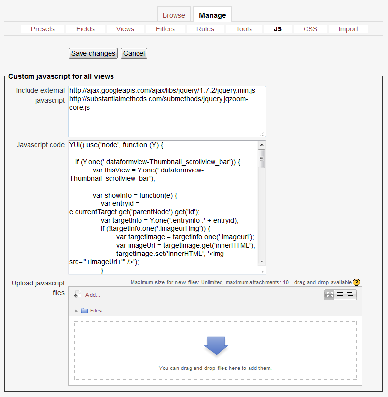 - Upload javascript files - You can upload javascript files into the Dataform files area in Moodle's file system. These files become part of the Dataform instance to which they are uploaded and are included in Dataform presets and backups.
