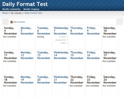 El formato de curso Diario muestra cada sección como un día. Está basado en el formato de curso semanal, y está diseñado para talleres y cursos cortos. Este formato de curso está disponible desde el plugins directory o https://github.com/nrobbins/moodle_format_days.