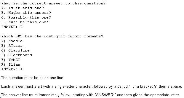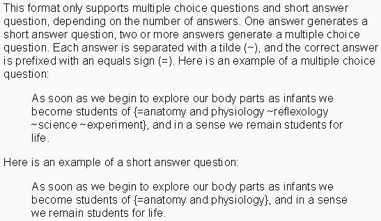 - Este formato sólo soporta preguntas de opción múltiple. Cada pregunta se separa con un tilde (~), y la respuesta correcta se precede con un signo de igual (=). Un ejemplo: