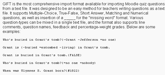- GIFT es el formato de importación de preguntas más amigable para Moodle de todos los formatos disponible. Su diseño permite que los profesores pueden escribir las preguntas en un archivo de texto de forma fácil. Permite preguntas de opción múltiple, Verdadero o Falso, Cortas, Emparejar y numéricas, también permite las preguntas de rellenar huecos insertándolas como _____ . Se pueden mezclar Varios tipos de preguntas en un solo archivo del texto, y este formato también permite líneas comentarios, los nombres de la pregunta, retroalimentación y los porcentaje-peso (ponderar) calificaciones. Veamos algunos ejemplos: