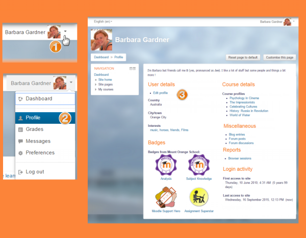Usted puede tener acceso a su perfil desde el menú del usuario en el extremo superior derecho. Allí es donde Usted verá su nombre y una flecha. Haga click allí (1) para abrir el menú (2) Al hacer click en el enlace hacia su Perfil le mostrará a Usted otras opciones, tales como la lista de sus cursos, cualquier entrada en un foro o blog y un enlace para editar su propio perfil (3).