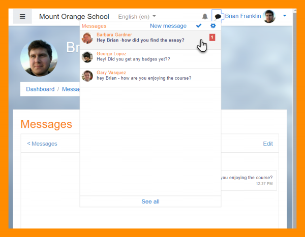 Usted puede mandar mensajes a personas desde el menú del usuario > Mensajes. Los profesores también pueden añadir un Bloque de mensajes a la página del curso para hacer más fácil el enviar mensajes.