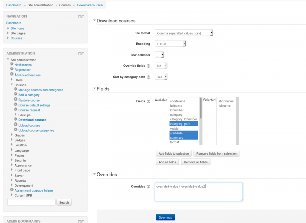 - Proceed to Administration > Site administration > Courses > Download courses