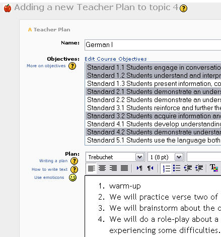 - Puede introducirse una lista de objetivos por cada curso. Pueden ser editados desde la página de Actualización del Plan del Profesor (Update Teacher Plan).