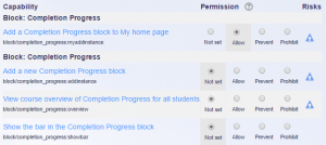 Controla si es que el bloque de Progreso de Finalización puede ser añadido a una página del curso. Por defecto, esto está permitido para los siguientes roles arquetipos:- Profesor (editingteacher)