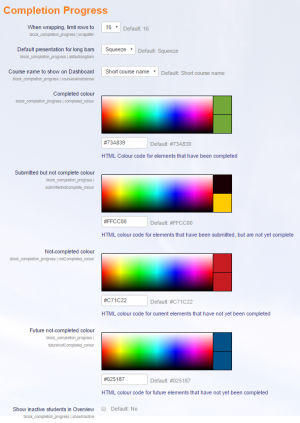 El bloque puede añadirse al Tablero y combinar el contenido del bloque de Progreso de Finalización visible de los cursos en los que un usuario está inscrito. Por defecto, el nombre del curso mostrado para cada curso relevante es el nombre corto del curso, pero algunass instituciones/organizaciones podrían pensar que esto no fuera apropiado en relación con su esquema usado para nombrar cursos, por lo que puede seleccionarse un nombre completo del curso. - Colores