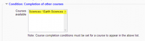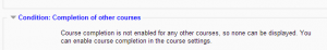 This setting allows you to make "the completion of another course" as a condition for completing the course you are currently working in. This does not block the student from your current course; it simply means that the current course will not be marked complete until the first course has been marked complete. Thus, completion of the current course is dependent upon completion of an earlier course. Just select one or more courses in the "Courses available box".