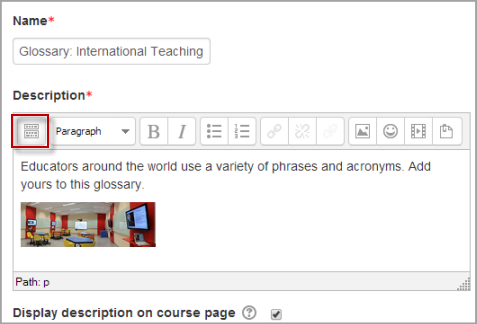 Si se marca este cuadro, aparece la descripción en la página del curso precisamente bajo el nombre del glosario.