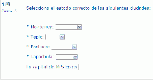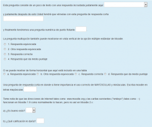 - Se podrían emplear preguntas del tipo de respuesta numérica o de respuesta corta si se definen tolerancias numéricas y ortográficas. Por ejemplo: ¿Cual es el valor de pi (con tolerancia de +/-1%)? o ¿Cómo se escribe en italiano la capital de Italia?.