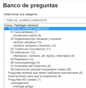 Ejemplo de un banco de preguntas con varias categorías que corresponden a cada uno de los 8 temas del programa del curso y una categoría especial para las preguntas abiertas (tipo ensayo) que deben calificarse manualmente. (haga click para agrandar la imagen) |