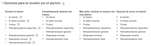 - Configure las opciones de revisión para controlar cuando verán los alumnos la información sobre sus intentos de examen; como por ejemplo, la retroalimentación. Generalmente se recomienda usar retroalimentación diferida.