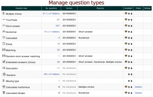 Un administrador (o encargado o cualquier otro usuario con la capacidad moodle/question:config) puede gestionar tipos de preguntas disponibles en el sitio Administración > Administración del sitio > Plugins > Tipos de preguntas > Gestionar tipos de preguntas.