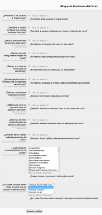 - ¿Deberían de tener contenido todas las secciones? - Cuando se habilita señalará cualquier sección que esté vacía, estimulando a los editores a que, o le añadan contenido, o al vez a que usen la opción para "Limpiar Curso" en caso de que no se necesiten secciones vacías adicionales