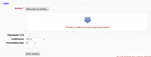 En lugar de subir el archivo de texto, puede simplemente arrastrarlo desde el escritorio de su computadora casera y soltarlo dentro del área de subida, como se demuestra en el screencast Drag and drop new users into Moodle 2.3 (by Mary Cooch).