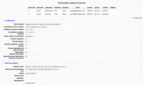 - Vista previa de subida de usuarios - revisar configuraciones y configuraciones del perfil de usuario por defecto