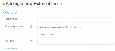 - External tool type -this is how Moodle communicates with the tool provider. If in doubt, leave as default. If your administrator has made a tool available sitewide, you will be able to select it here: