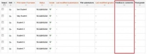 Tome nota de que si se habilitan los comentarios al envío en Administración > Plugins > Módulos de actividad > Tarea > Plugins de envío entonces los estudiantes podrán añadir una nota para su profesor al enviar su trabajo. Si se habilita la calificación ciega, los comentarios de los estudiantes se muestrancomo "Participante 01 etc" para evitar que se revelen sus identidades. Estos comentarios aparecerán en la tabla de calificación en la columna de comentarios al Envío.