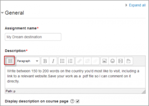 En Moodle 2.6 y anteriores: Elija "Mostrar herramientas para edición" para mostrar el editor de texto enriquecido y arrastre la orilla de abajo a la derecha de la caja de texto para expandirla.
