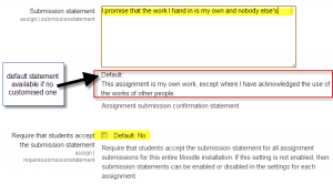 If the administrator has given teachers the option of using a submission statement or not, then it will be available in the assignment settings screen. The section #Submission_Statement explains how an administrator can set this up.