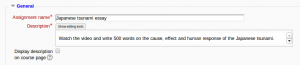 Dale a tu tarea un nombre descriptivo (por ejemplo, "Informe sobre el Tema 1"). El título introducido aquí será el nombre que los/as estudiantes ven en la página principal de la asignatura. Los/as estudiantes harán clic en el nombre para ver los detalles de la tarea y, en su caso, presentar sus trabajos.