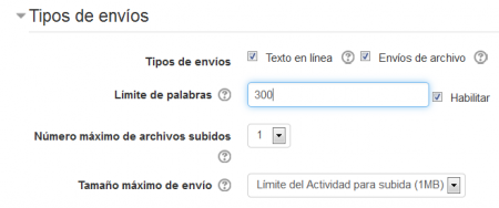 Este parámetro especifica el tamaño máximo que puede tener cada uno de los archivos que los estudiantes deben subir como parte de la tarea. Este tamaño máximo de archivo sólo puede ser igual o menor que el límite de tamaño que se ha definido en los ajustes del curso (que a su vez sólo puede ser igual o menor que el límite de tamaño que los administradores han fijado para el sitio). Por tanto, si crees que tus estudiantes necesitan más espacio que el máximo que puedes seleccionar aquí, debes ir al bloque Administración, pulsar en la Administración del curso, allí en Editar ajustes y aumentar el tamaño máximo de los archivos que se permiten subir en cualquier lugar de la asignatura. Es decir, en el apartado "Archivos y tamaño máximo de los archivos que pueden subir los participantes" de los ajustes del curso deberás aumentar ese valor. El tamaño máximo de cada archivo se muestra a los/as estudiantes en el momento en que suben los archivos.