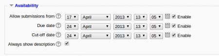 Nota: Esta página describe las configuraciones para el nuevo módulo de Tarea de Moodle 2.3 en adelante. Para la documentación acerca de configuraciones para Tareas (2.2), vea Assignment settings en la documentación en Inglés para Moodle 2.2.
