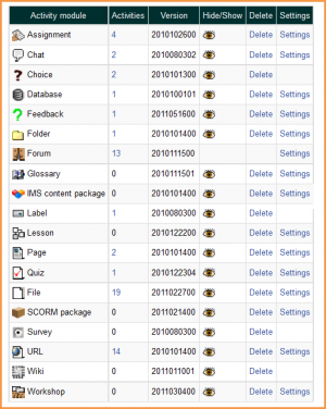 The activities column lists how many activities for each module there are on your Moodle site. If you click on a number, the list of courses containing that activity will be displayed.