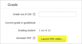 If the student has uploaded a PDF file you will see a link to Launch the PDF editor on the students' individual grading screen. This will display the PDF inline, allowing you to annotate it, using a variety of tools, stamps (if uploaded by the admin) and comments which may be saved to a comments bank. When the annotations are complete, clicking to save the changes will result in it being displayed to the student as part of their feedback. (Note that simply clicking on the file itself will not display it inline for annotating.)