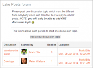 - Create a forum where only the teacher can start discussions, but the students can only reply. Each thread you start contains an essay question (or several similar ones). The students make a bullet point plan for the essay and post it as a reply. This works well as a revision strategy as the students can see how others have approached the same task. Once everyone has posted their plan, you can start a discussion as to which plans seem better and why. Creating a scale to use for rating the posts can be useful so that the students can see how helpful other people think their effort were. (Note: At this time, there is no option to hide the "Add new discussion topic" button, so you need to tell your students not to start discussion threads, but to only reply to threads started by the teacher. If you only need one thread, then you can use the "a single simple discussion" format and the "Add new discussion topic" button is not available to the students.)