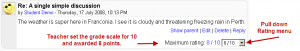 When rating is allowed, the qualified user will see "Rate this post" and a pull down menu after an entry (not their own). The menu displays a escala that the forum creator selected in the Forum grade settings. The user can rate more than one post at a time. When finished they should click the "submit my ratings" button at the bottom of the page.