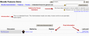 In this forum type, students will see the introduction text in a separate space above the discussion field, in which you will see the information such as the title of the discussion (which means the forum's title), its author, the number of replies and the date of the last post.
