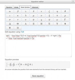 Si estuviera habilitado algún filtro , ya sea MathJax o la Notación TeX (en Administración > Administración del sitio > Plugins > Filtros > Gestionar filtros), entonces se proporciona un botón para edición de ecuaciones en la barra de herramientas, el cual invoca al editor de ecuaciones.