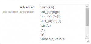 Se pueden añadir, quitar o reordenar comandos (órdenes) desde Administración > Administración del sitio > Plugins > Editores de texto > Editor HTML Atto > Configuraciones del editor de ecuaciones