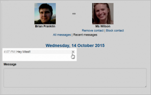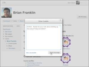 - un botón para mensajes en las páginas del perfil le permite enviar un mensaje mediante una caja en ventana emergente sin abandonar la página en la que está (nuevo en Moodle 2.9) ¡Nueva característica