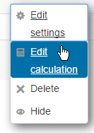 - Elija 'Editar configuraciones' y después 'Editar cálculo'. Nota: si Usted no observa esto, entonces necesita ser habilitado en Administración del sitio > Calificaciones > Configuraciones de reporte > Reporte del calificador