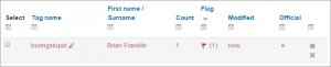 Cuando alguien añade una marca incorrecta o inapropiada, otros usuarios podrían hacer click en la palabra (1) para ir a la pantalla en donde ellos pueden señalizarla como inapropiada (2) El administrador puede modificar o eliminar las marcas inapropiadas desde Administración del sitio > Apariencia > Gestionar Marcas (Tags) (3)