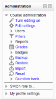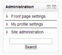 Lo que aparece en el bloque de Administración depende del Contexto (la página mostrada y los permisos del usuario). Por ejemplo, un administrador del sitio en la portada del sitio tendrá configuraciones para la portada, mientras que un maestro dentro de un curso tendrá más opciones en administración del curso que un estudiante.