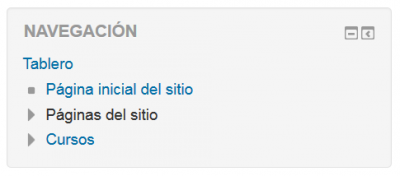 - Si se habilita, el bloque de navegación aparecerá en todas las páginas del sitio. Contiene un menú de árbol expandible que incluye a Tablero, Páginas del sitio y Cursos. Lo que aparece dentro del Bloque de navegación depende del rol del usuario, en donde está adentro del sitio Moodle, y cualquier configuración que hubiera sido aplicada globalmente.