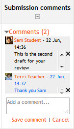 | Nota: Si se habilitan comentarios a los envíos en Administración > Plugins > Módulos de actividad > Tarea > Plugins de envío , los estudiantes podrán añadirle una nota a sus maestros cuando envíen su trabajo. Si se habilita la calificación anónima (a ciegas), los comentarios del estudiante se mostrarán en el Libro de calificaciones como "Participante 01 etc." para evitar el revelar las identidades. |