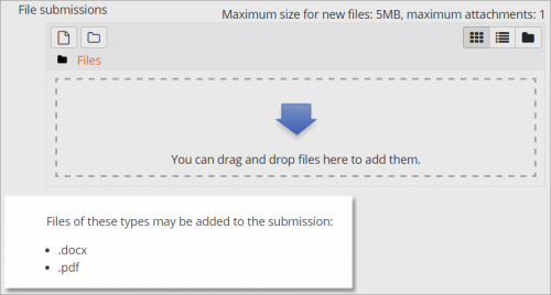 - A partir de Moodle 3.3, el profesor puede especificar los tipos de archivo que los estudiantes pueden subir a la Tarea. Los tipos de archivo pueden ser añadidos con sus extensiones de archivos, como por ejemplo .png y mp3, o también como image/png y audio/mp3. El dejar el campo vacío permitirá todos los tipos de archivo. Los tipos de archivo están separados por comas.