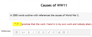 | Nota del traductor: La declaratoria al envío puede ser una advertencia a los estudiantes de que su trabajo debe ser original y que el hecho de copiar material de otro estudiante, o de un sitio web (como por ejemplo, la wikipedia o el rincón del vago), o del libro de texto, será considerado trampa y se castigará severamente. |
