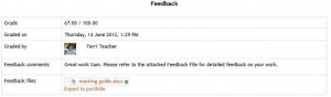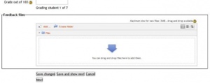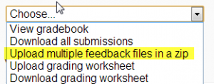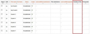- Esto les permite a quienes califican que puedan subir archivos con retroalimentaciones al calificar. Estos archivos pueden ser las tareas de los alumnos corregidas, documentos con comentarios, una guía para calificar completada o retrolimentación de audio hablado. Esto habilita la columna de Archivos de Retroalimentación en la pantalla para calificar las Tareas (acceda desde 'Ver/Calificar todos los envíos'.) Para subir archivos de retroalimentación, haga click en la palomita (tick) verde en la columna de calificación en la tabla de calificar y después suba, ya sea mediante arrastrar y soltar o usando el Selector de archivo.