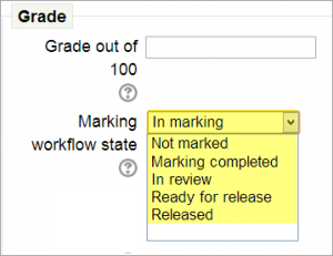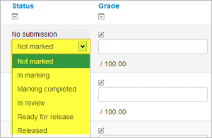 Si el Flujograma para calificar (vea arriba) está configurado a Sí, entonces es posible habilitar la asignación de calificadores. Esto significa que los profesores pueden ser seleccionados para calificar o revisar el trabajo enviado de estudiantes específicos. Los colegas pueden monitorear el progres mediante los estados del flujograma para calificar mostrados: